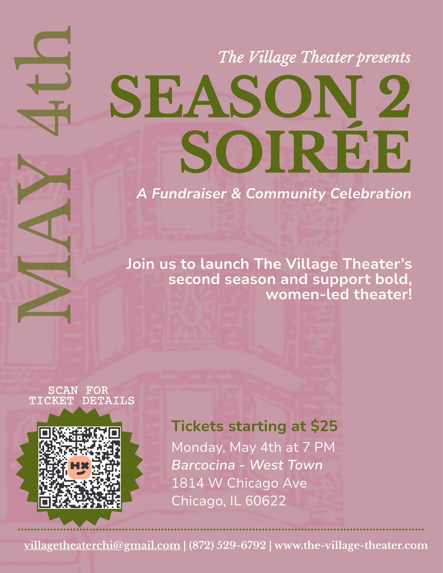 In 2026, The Village Theater is launching our second season of plays—and we need your support to make it happen. Join us on May 4th at 7 pm at Barcocina West Town for an evening of celebration including a bar and snacks, exclusive merchandise, games, and membership opportunities.